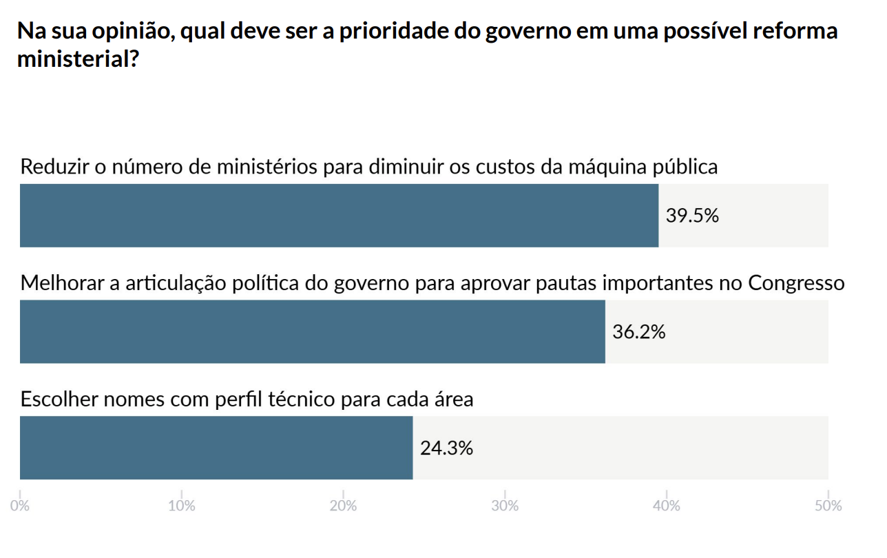Para 39,5% dos entrevistados, a prioridade com a reforma seria diminuir o número de ministros para economizar dinheiro dos cofres públicos.