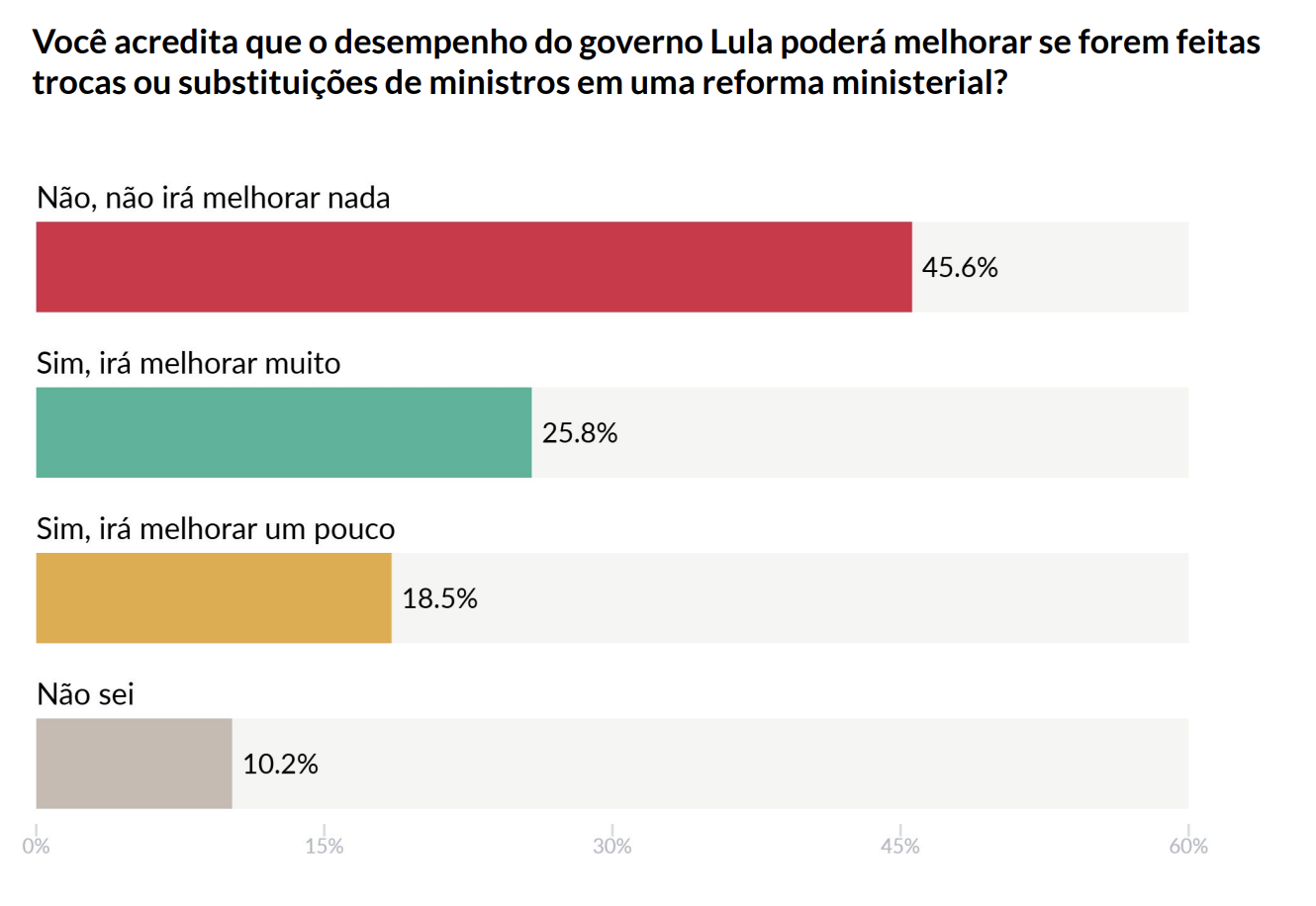 Pesquisa AtlasIntel mostra que 45,6% dos brasileiros avaliam que uma reforma ministerial não será responsável por melhorar o desempenho do governo de Luiz Inácio Lula da Silva (PT). A margem de erro é de 2 pontos percentuais. O levantamento foi divulgado em conjunto com a CNN Brasil.