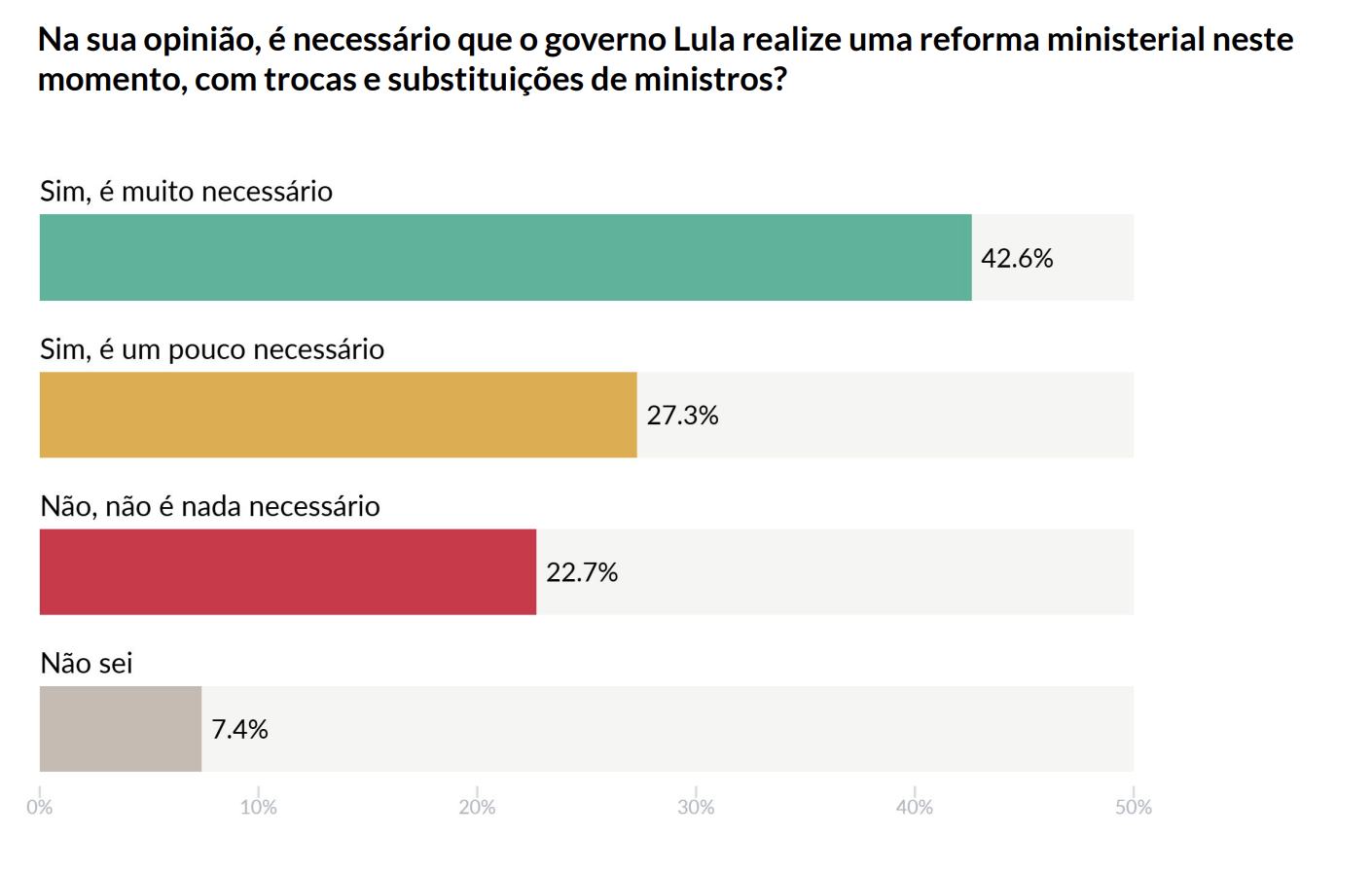 Apesar da percepção sobre a efetividade das mudanças, o levantamento mostra que 42,6% dos respondentes classificam as substituições nos ministérios como “muito” necessárias.