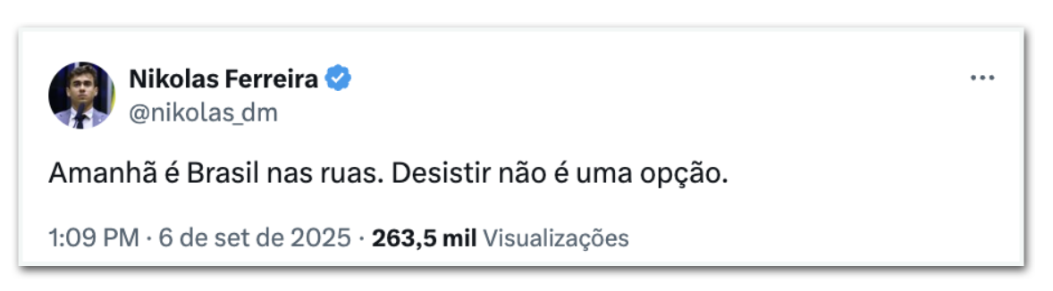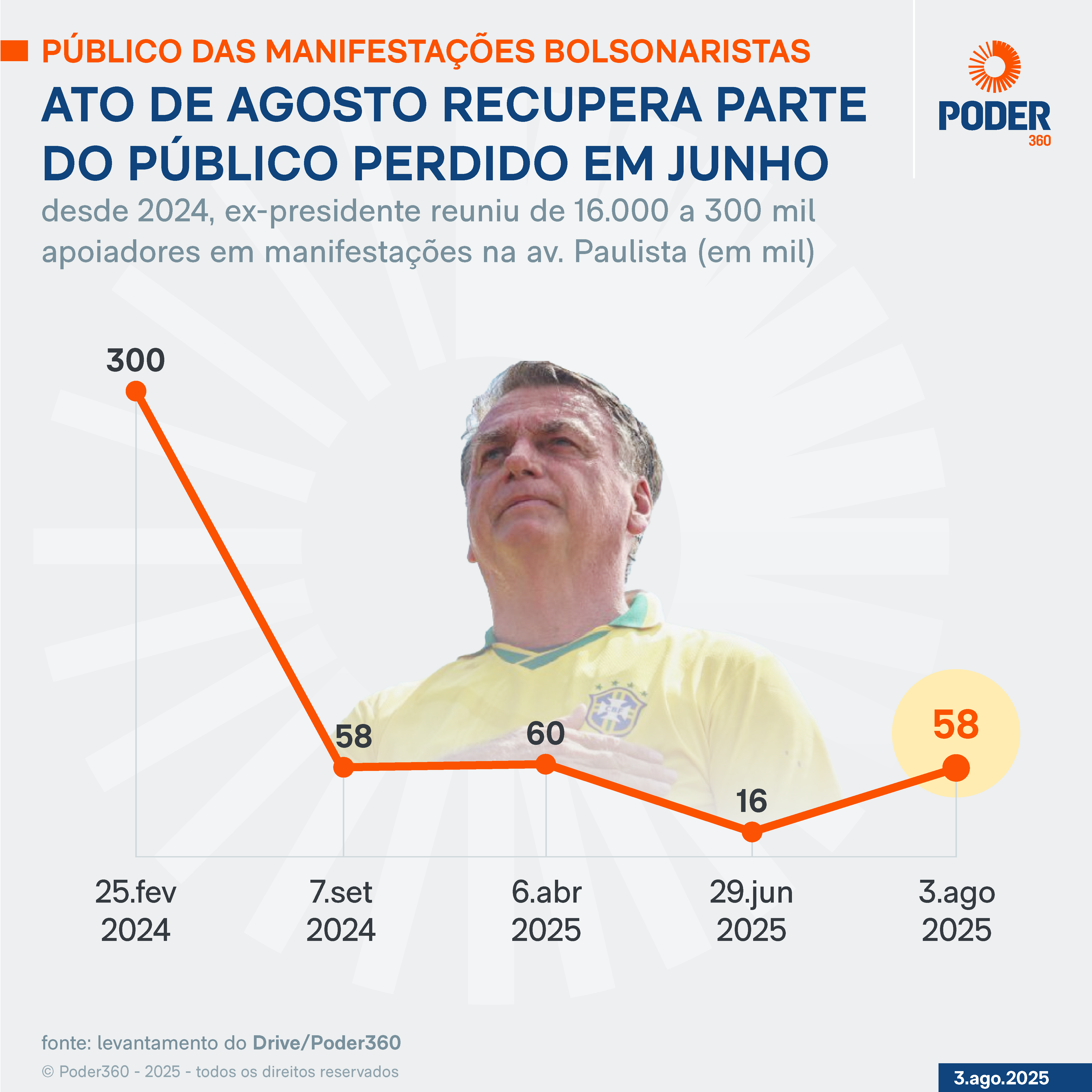 Em 2024, a manifestação do 7 de Setembro reuniu cerca de 58.000 pessoas na Paulista. Outros protestos foram realizados neste ano. O mais recente, em 3 de agosto, teve 57.600 participantes, de acordo com levantamento do Poder360.