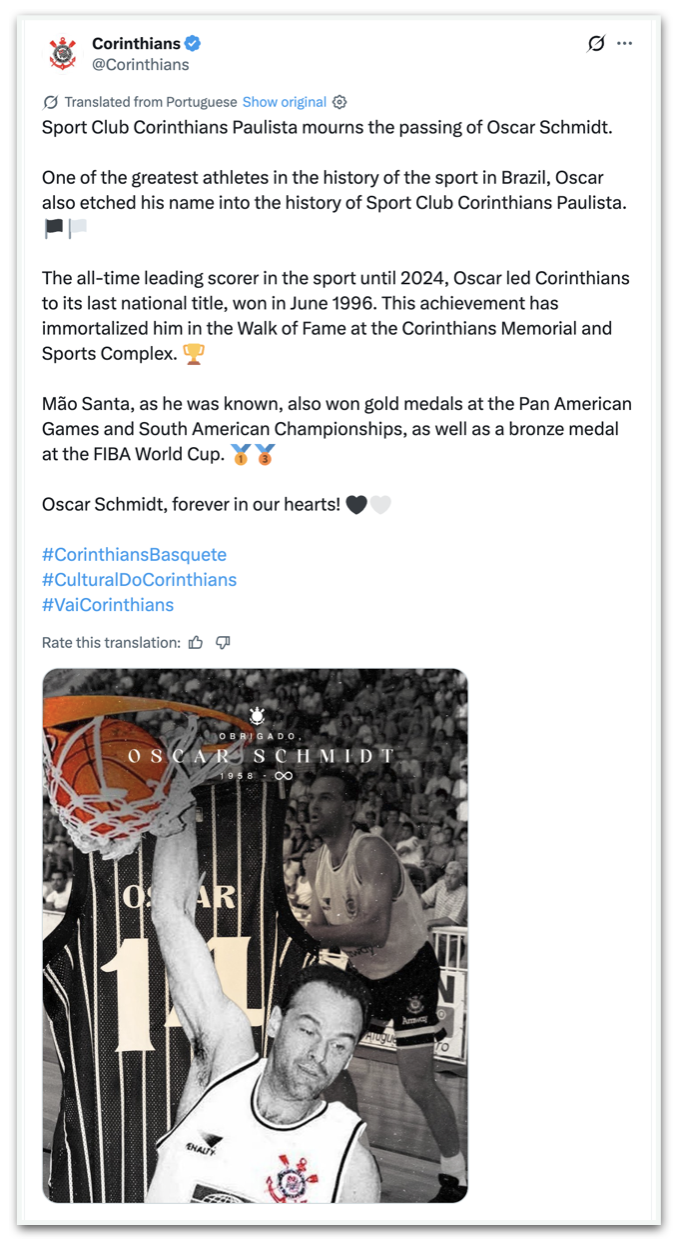 - Corinthians: “O Sport Club Corinthians Paulista lamenta o falecimento de Oscar Schmidt. Um dos maiores atletas da história do esporte no Brasil, Oscar também gravou seu nome na história do Sport Club Corinthians Paulista. O maior artilheiro de todos os tempos no esporte até 2024, Oscar levou o Corinthians ao seu último título nacional, ganho em junho de 1996. Essa conquista o imortalizou na Calçada da Fama no Corinthians Memorial and Sports Complex. Mão Santa, como era conhecido, também ganhou medalhas de ouro nos Jogos Pan-Americanos e Campeonatos Sul-Americanos, além de uma medalha de bronze na Copa do Mundo da FIBA. Oscar Schmidt, para sempre em nossos corações!”