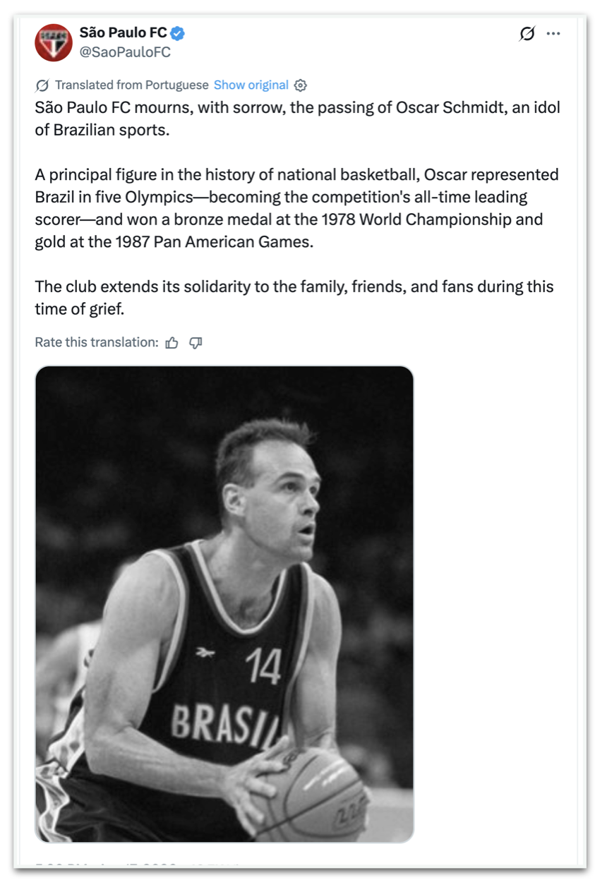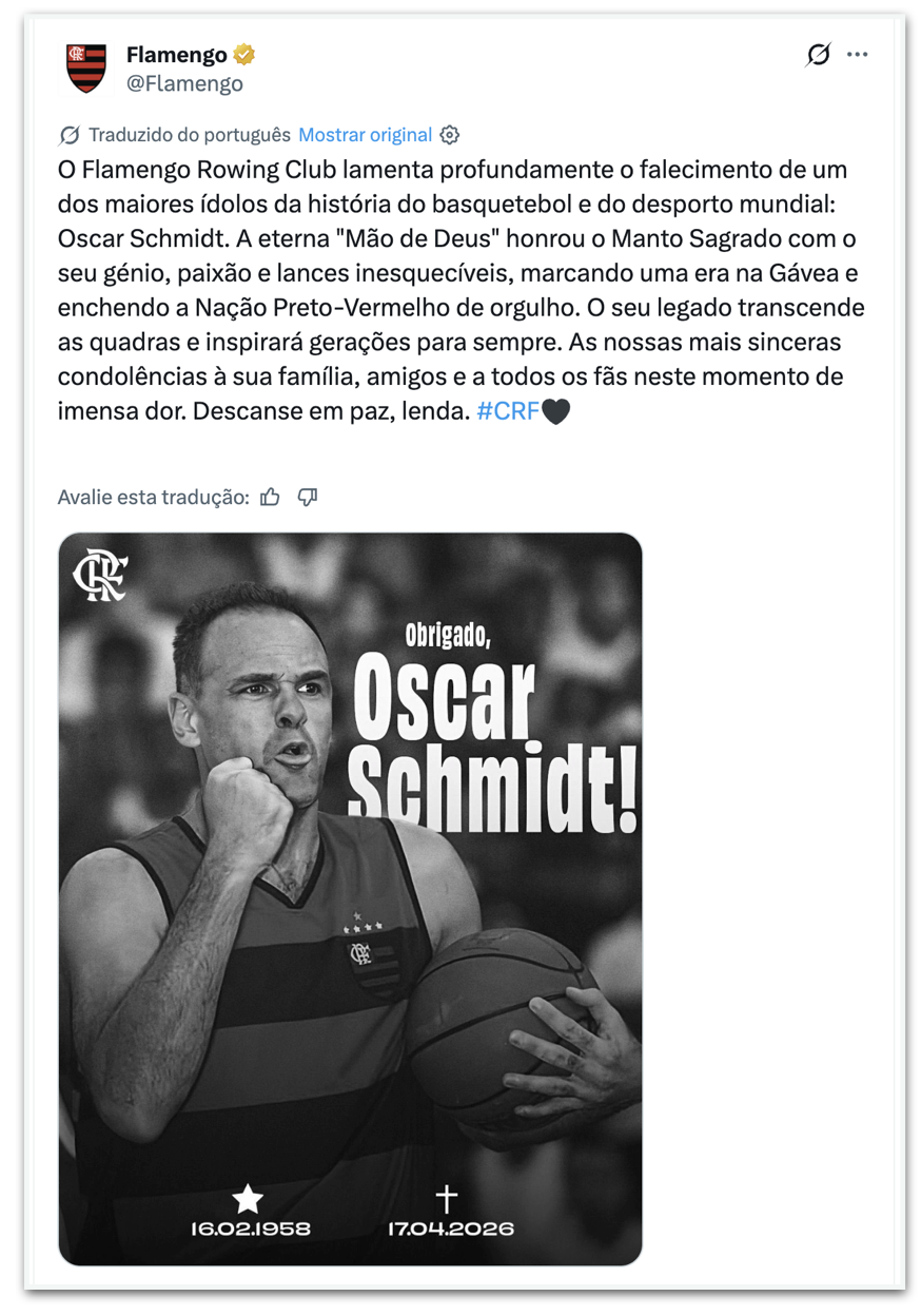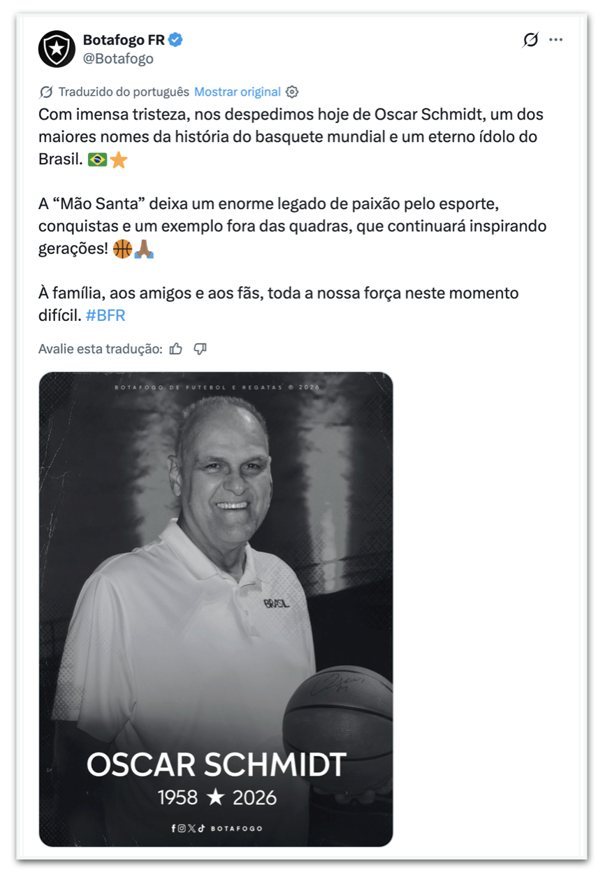 - Botafogo: “Com imensa tristeza, nos despedimos hoje de Oscar Schmidt, um dos maiores nomes da história do basquete mundial e um ídolo eterno do Brasil.A “Mão Santa” deixa para trás um enorme legado de paixão pelo jogo, conquistas e um exemplo fora da quadra, que continuará a inspirar gerações! Para a família, amigos e fãs, toda a nossa força neste momento difícil. #BFR”