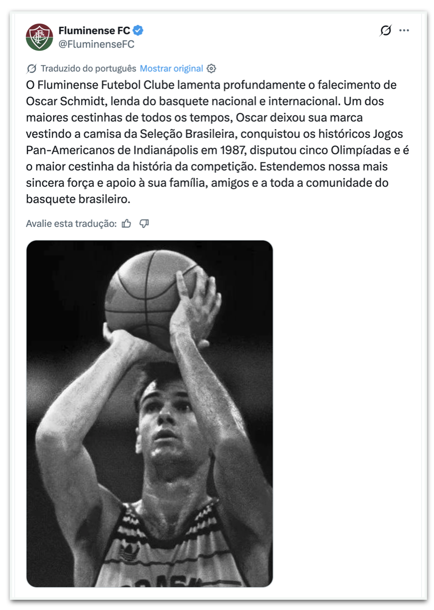 - Fluminense: “O Fluminense Football Club lamenta profundamente o falecimento de Oscar Schmidt, lenda do basquete nacional e mundial. Um dos maiores cestinhas de todo o esporte, Oscar marcou época com a camisa da seleção brasileira, conquistou o histórico Pan-Americano de Indianápolis, em 1987, disputou cinco Jogos Olímpicos e é o maior cestinha da história da competição.Desejamos muita força aos familiares, amigos e a toda a comunidade do basquete brasileiro.”