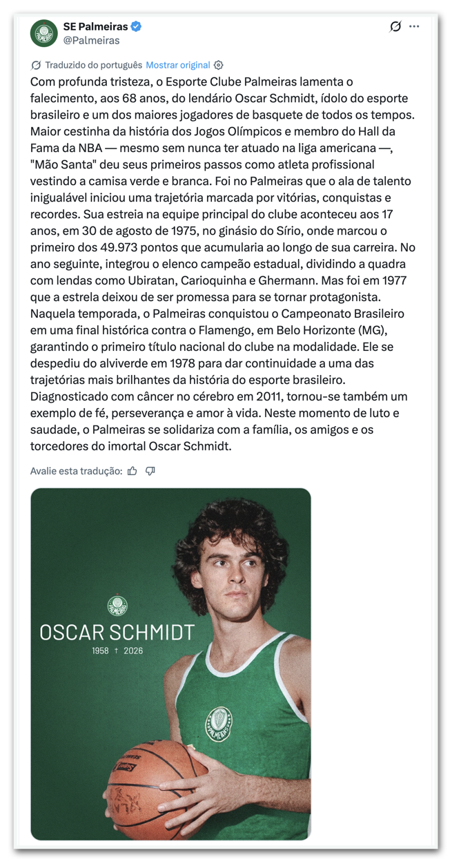 - Palmeiras: “Com profunda tristeza, a Sociedade Esportiva Palmeiras lamenta o falecimento, aos 68 anos, do lendário Oscar Schmidt, ídolo do esporte brasileiro e um dos principais jogadores de basquete de todos os tempos. Maior cestinha da história dos Jogos Olímpicos e integrante do Hall da Fama da NBA – mesmo sem nunca ter atuado na liga americana –, o Mão Santa deu seus primeiros passos como atleta profissional vestindo a camisa alviverde. Foi no Palmeiras que o ala de talento incomum iniciou uma caminhada marcada por vitórias, conquistas e recordes. A estreia no time adulto do Verdão aconteceu aos 17 anos, em 30 de agosto de 1975, no ginásio do Sírio, onde marcou os primeiros dos 49.973 pontos que anotaria ao longo da carreira.No ano seguinte, participou do elenco campeão paulista, dividindo quadra com nomes consagrados como Ubiratan, Carioquinha e Ghermann. Mas foi em 1977 que o craque deixou de ser promessa para se tornar protagonista. Naquela temporada, o Palmeiras conquistou o Campeonato Brasileiro em uma final histórica contra o Flamengo, em Belo Horizonte (MG), garantindo o primeiro título nacional do clube na modalidade. Despediu-se do Alviverde em 1978 para dar sequência a uma das mais brilhantes trajetórias da história do esporte nacional. Diagnosticado com câncer no cérebro em 2011, transformou-se também em um exemplo de fé, perseverança e amor à vida. Neste momento de dor e saudade, o Palmeiras se solidariza com os familiares, amigos e fãs do imortal Oscar Schmidt.”