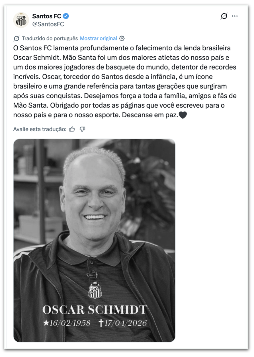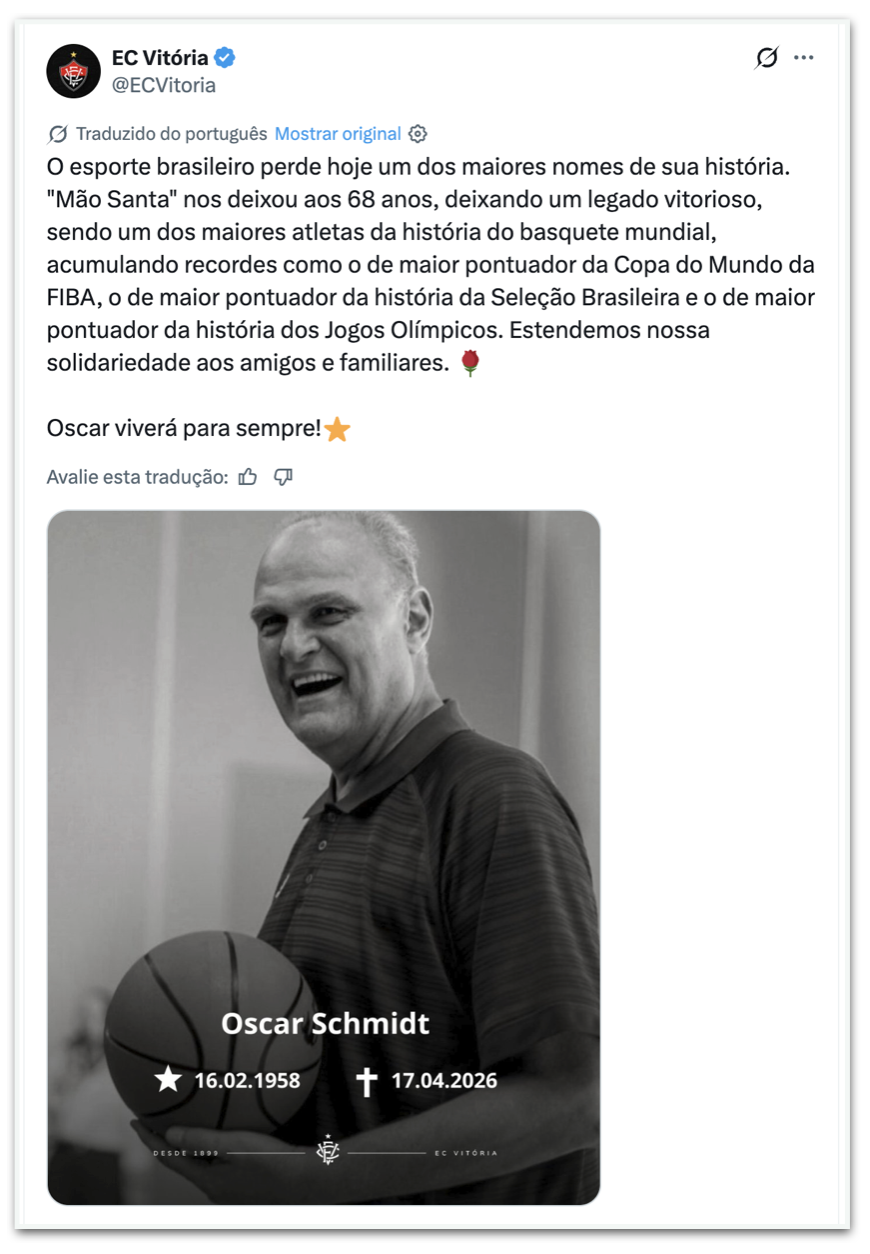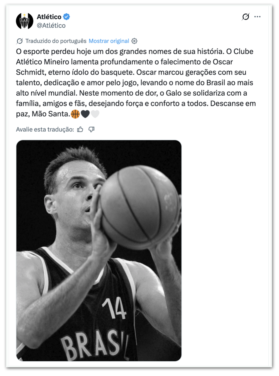 - Atlético-MG: “O esporte perdeu hoje um dos grandes nomes da sua história. O Clube Atlético Mineiro lamenta profundamente o falecimento de Oscar Schmidt, ídolo eterno do basquete. Oscar marcou gerações com seu talento, dedicação e amor pelo jogo, levando o nome do Brasil ao mais alto nível mundial. Neste momento de dor, o Galo se solidariza com familiares, amigos e fãs, desejando força e conforto a todos. Descanse em paz, Mão Santa.”