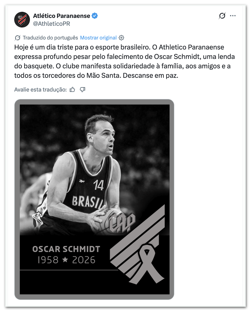 - Athletico-PR: “Hoje é um dia triste para o esporte brasileiro. O Athletico Paranaense expressa profundo pesar pelo falecimento de Oscar Schmidt, lenda do basquete. O clube presta solidariedade à família, aos amigos e a todos os fãs do Mão Santa. Descanse em paz.”