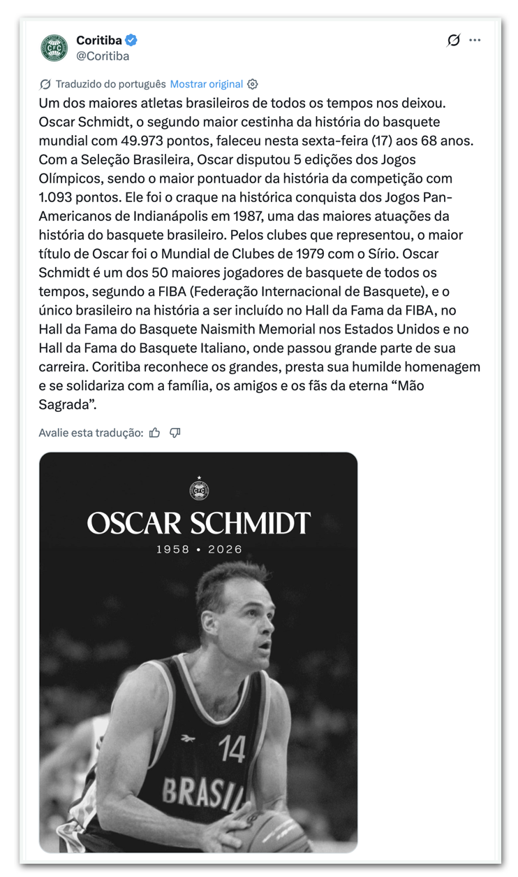 - Coritiba: “Um dos maiores atletas de todos os tempos do Brasil nos deixou. Oscar Schmidt, segundo maior cestinha da história do basquete mundial, com 49.973 pontos, faleceu nesta sexta-feira (17), aos 68 anos. Com a Seleção Brasileira, Oscar disputou 5 edições de Jogos Olímpicos, sendo o maior cestinha da competição em toda a história, com 1093 pontos. Foi o principal jogador da histórica conquista do Pan-Americano de Indianápolis, em 1987, uma das maiores exibições da história do basquete brasileiro. Pelos clubes que defendeu, Oscar teve como maior título o Mundial Interclubes de 1979, com o Sírio. Oscar Schmidt é um dos 50 maiores jogadores de basquete de todos os tempos, segundo a FIBA (Federação Internacional de Basquete), e o único brasileiro da história a estar presente no Hall da Fama da FIBA, Hall da Fama do Basquete dos Estados Unidos e Hall da Fama do Basquete da Itália, onde passou grande parte de sua carreira.O Coritiba reconhece os grandes, presta sua singela homenagem e solidariza-se com familiares, amigos e fãs do eterno “Mão Santa”.”