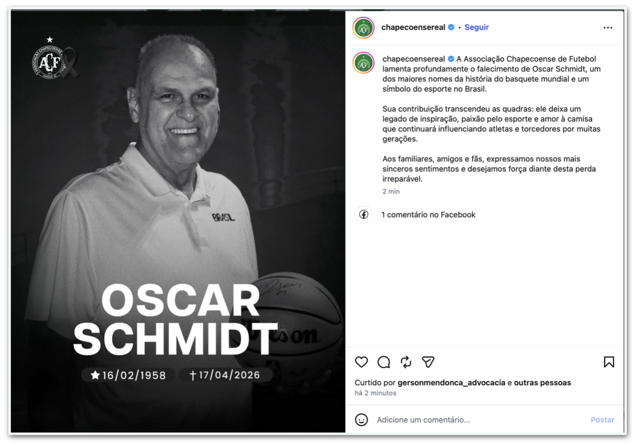 - Chapecoense: “A Associação Chapecoense de Futebol lamenta profundamente o falecimento de Oscar Schmidt, um dos maiores nomes da história do basquete mundial e um símbolo do esporte no Brasil. Sua contribuição transcendeu as quadras: ele deixa um legado de inspiração, paixão pelo esporte e amor à camisa que continuará influenciando atletas e torcedores por muitas gerações. Aos familiares, amigos e fãs, expressamos nossos mais sinceros sentimentos e desejamos força diante desta perda irreparável.”