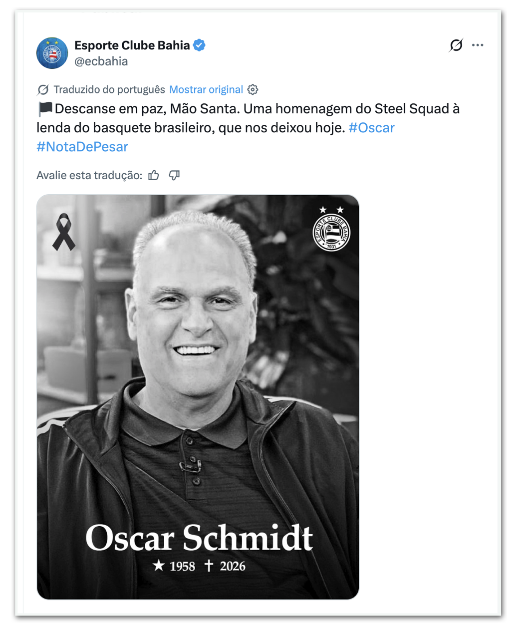 - Bahia: “Descanse em paz, Mão Santa. Uma homenagem do Esquadrão de Aço ao brasileiro lenda do basquete mundial, que nos deixou hoje aos 68 anos. #Oscar#NotaDePesar”