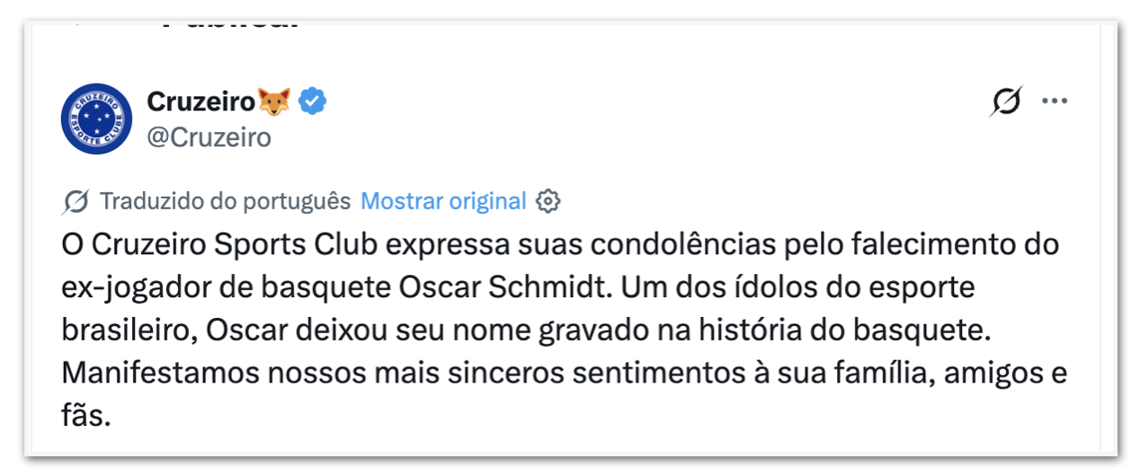 - Cruzeiro: “O Clube Esportivo Cruzeiro estende condolências pelo falecimento do ex-jogador de basquete Oscar Schmidt. Um dos ídolos dos esportes brasileiros, Oscar deixou seu nome gravado na história do basquete. Expressamos nossos sentimentos sinceros à sua família, amigos e fãs.”