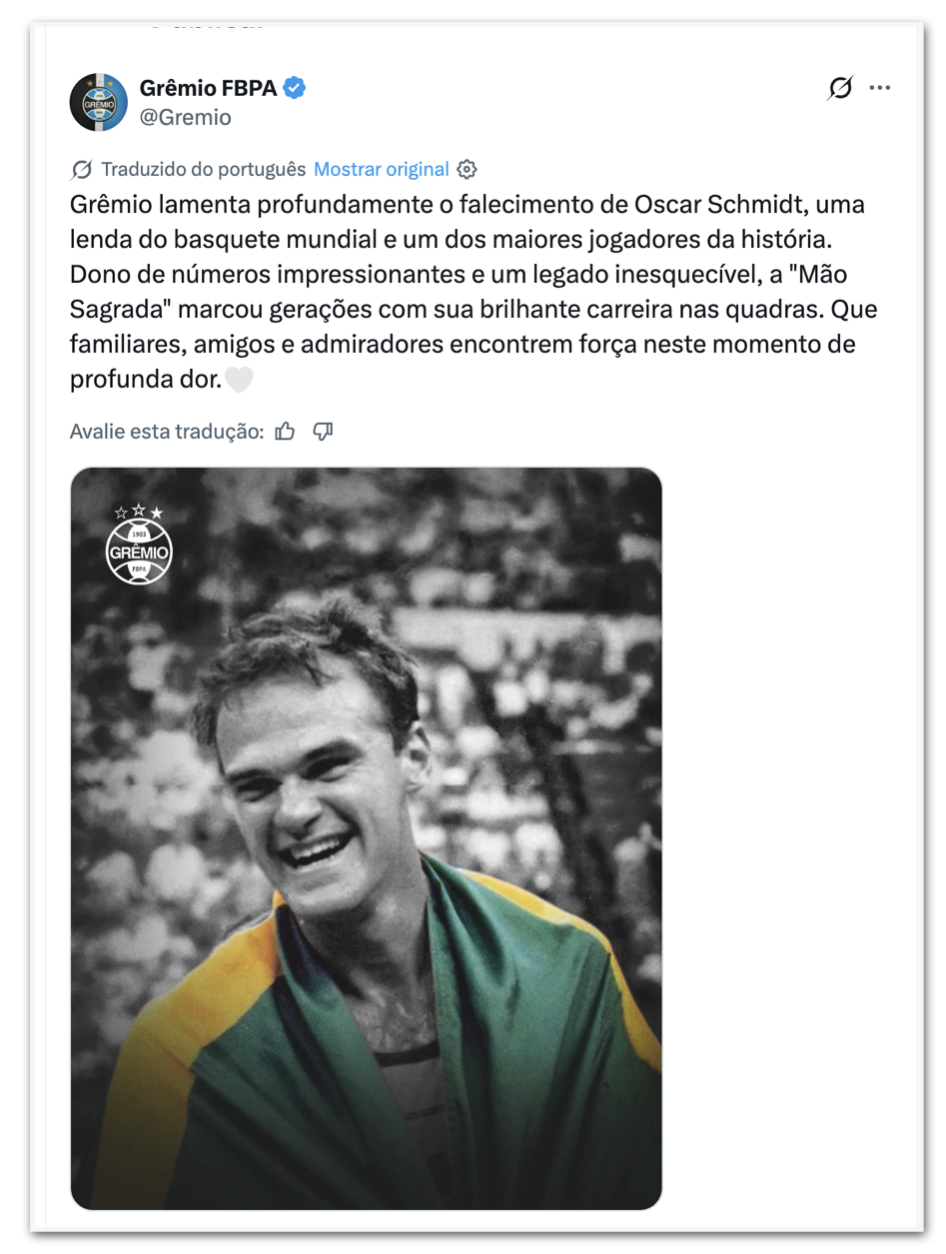 - Grêmio: “O Grêmio lamenta profundamente a morte de Oscar Schmidt, uma lenda do basquete mundial e um dos maiores jogadores da história. O proprietário de números impressionantes e um legado inesquecível, a “Mão Santa” marcou gerações com sua brilhante carreira nas quadras. Que a família, amigos e admiradores encontrem força neste momento de profunda dor.”