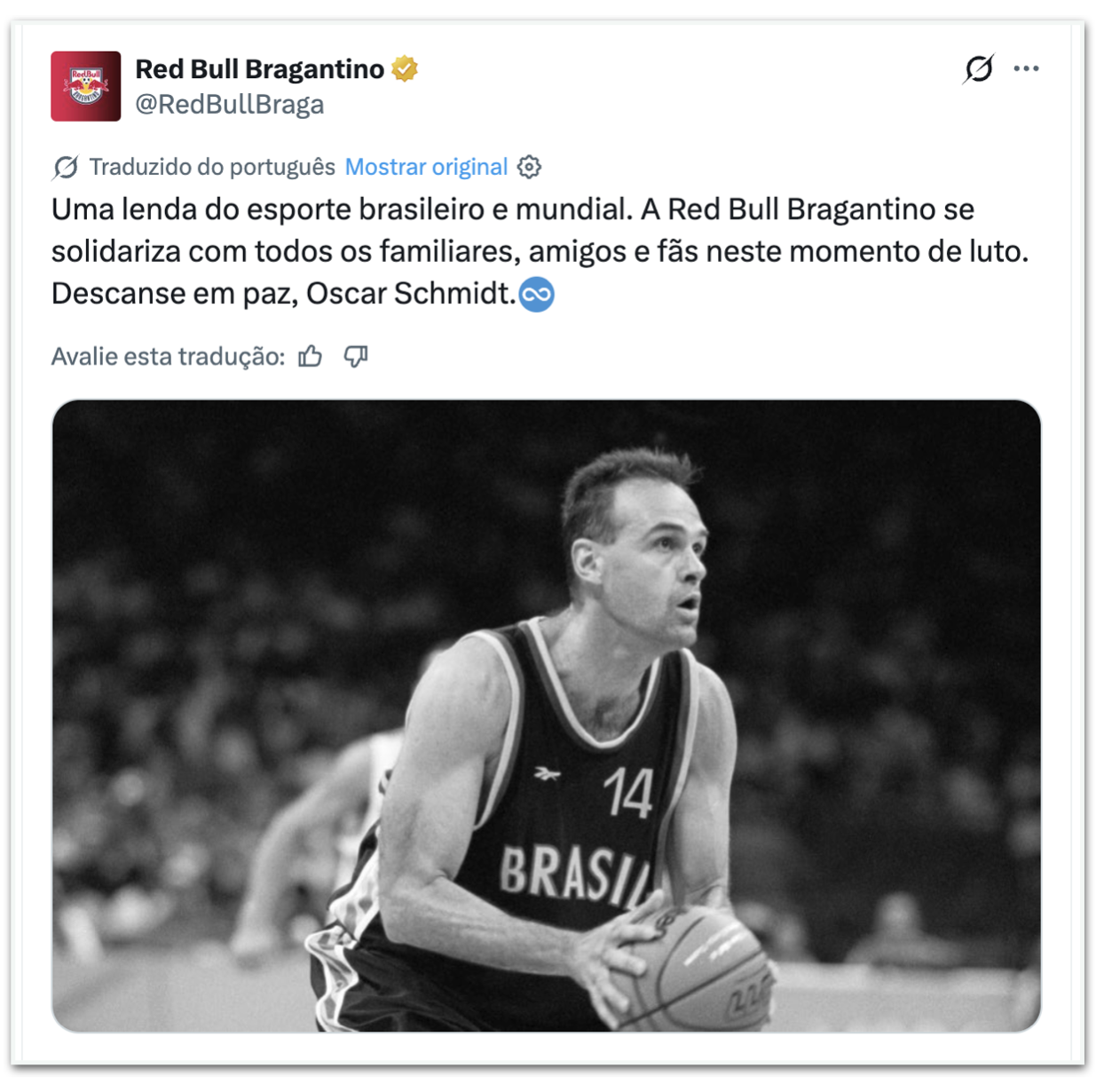 - Red Bull Bragantino: “Uma lenda dos esportes brasileiros e mundiais. O Red Bull Bragantino se solidariza com todos os membros da família, amigos e fãs durante este período de luto. Descanse em paz, Oscar Schmidt.”