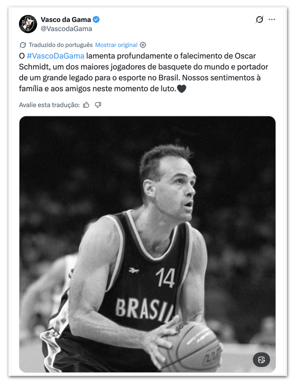 - Vasco: “O #VascoDaGama lamenta profundamente o falecimento de Oscar Schmidt, um dos maiores jogadores de basquete do mundo e portador de um grande legado para o esporte no Brasil. Nossas condolências à família e amigos neste momento de luto.”