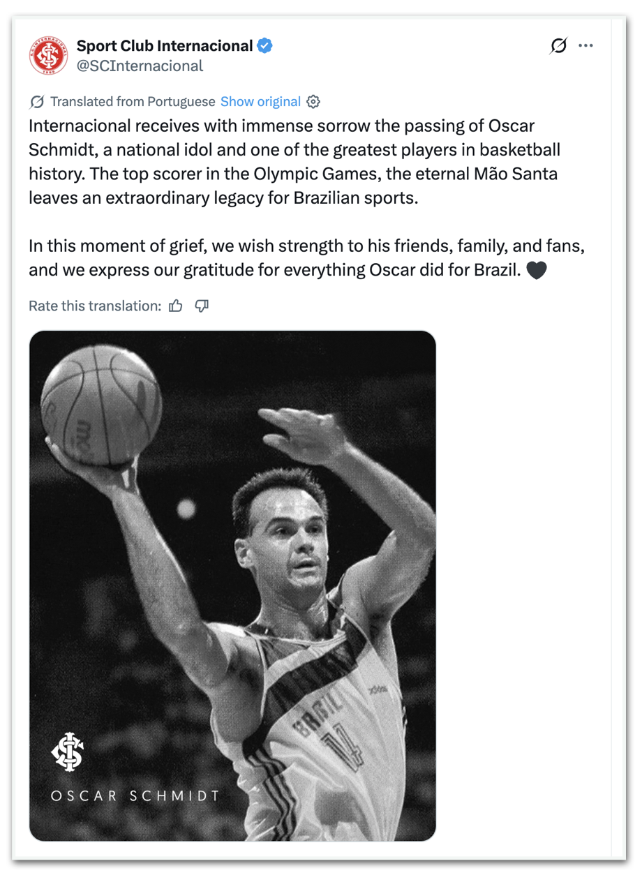 - Internacional: “O Internacional recebe com imensa tristeza o falecimento de Oscar Schmidt, um ídolo nacional e um dos maiores jogadores da história do basquete. O artilheiro dos Jogos Olímpicos, o eterno Mão Santa deixa um legado extraordinário para os esportes brasileiros. Neste momento de luto, desejamos força aos seus amigos, familiares e fãs, e expressamos nossa gratidão por tudo o que Oscar fez pelo Brasil.”