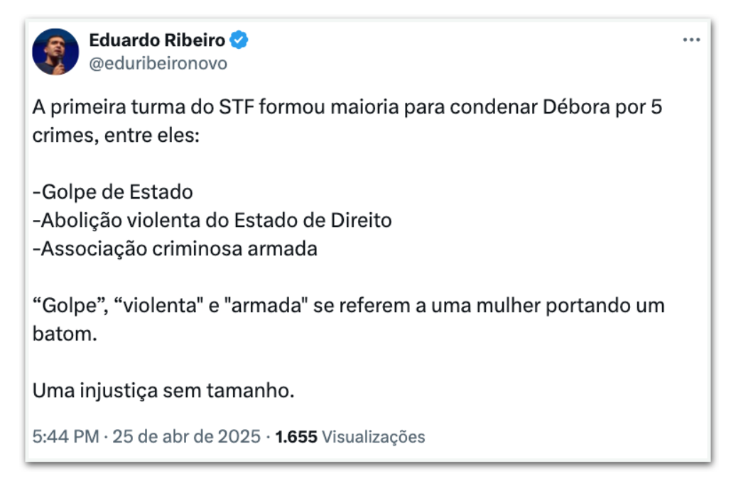 Já o presidente do Partido Novo, Eduardo Ribeiro, ironizou a sentença, afirmando que os termos “golpe”, “violenta” e “armada” se referem a uma mulher portando um batom. Ele disse que a decisão é “uma injustiça sem tamanho”.