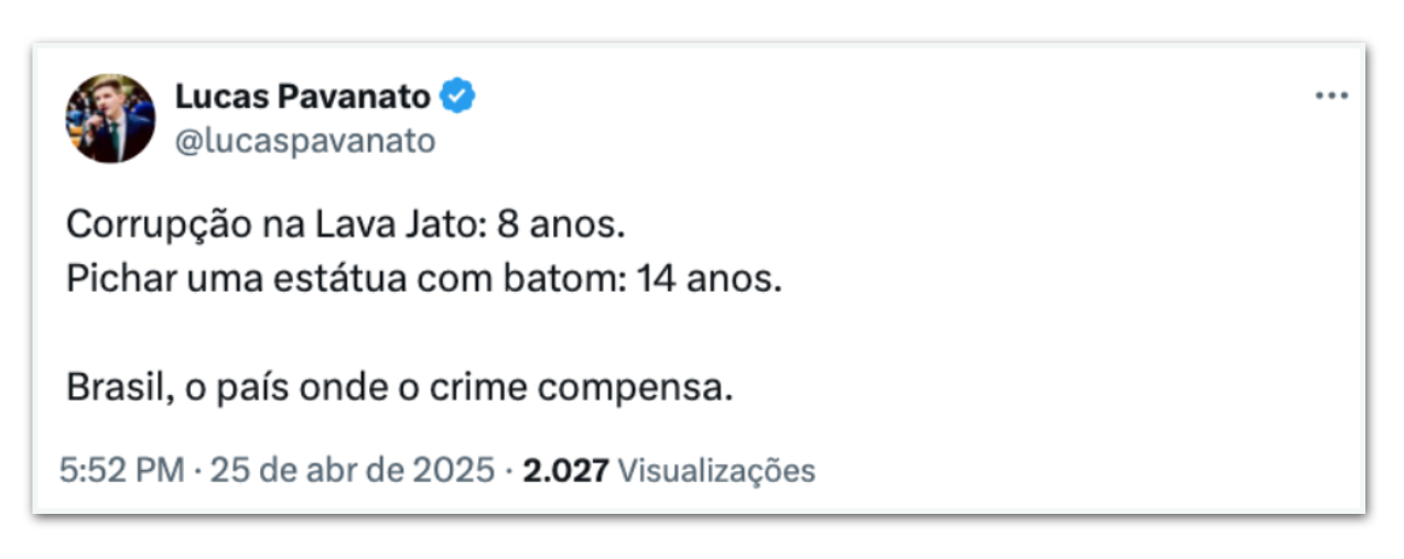 “Corrupção na Lava Jato: 8 anos. Pichar uma estátua com batom: 14 anos. Brasil, o país onde o crime compensa”, afirmou Pavanato no X.