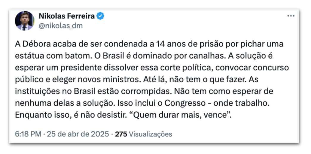 O deputado Nikolas Ferreira (PL-MG) afirmou que a solução seria “esperar um presidente dissolver essa corte política” e criticou o sistema judiciário e o Congresso. Ele declarou em seu perfil oficial no X que o Brasil é “dominado por canalhas” e que as instituições do país “estão corrompidas”.