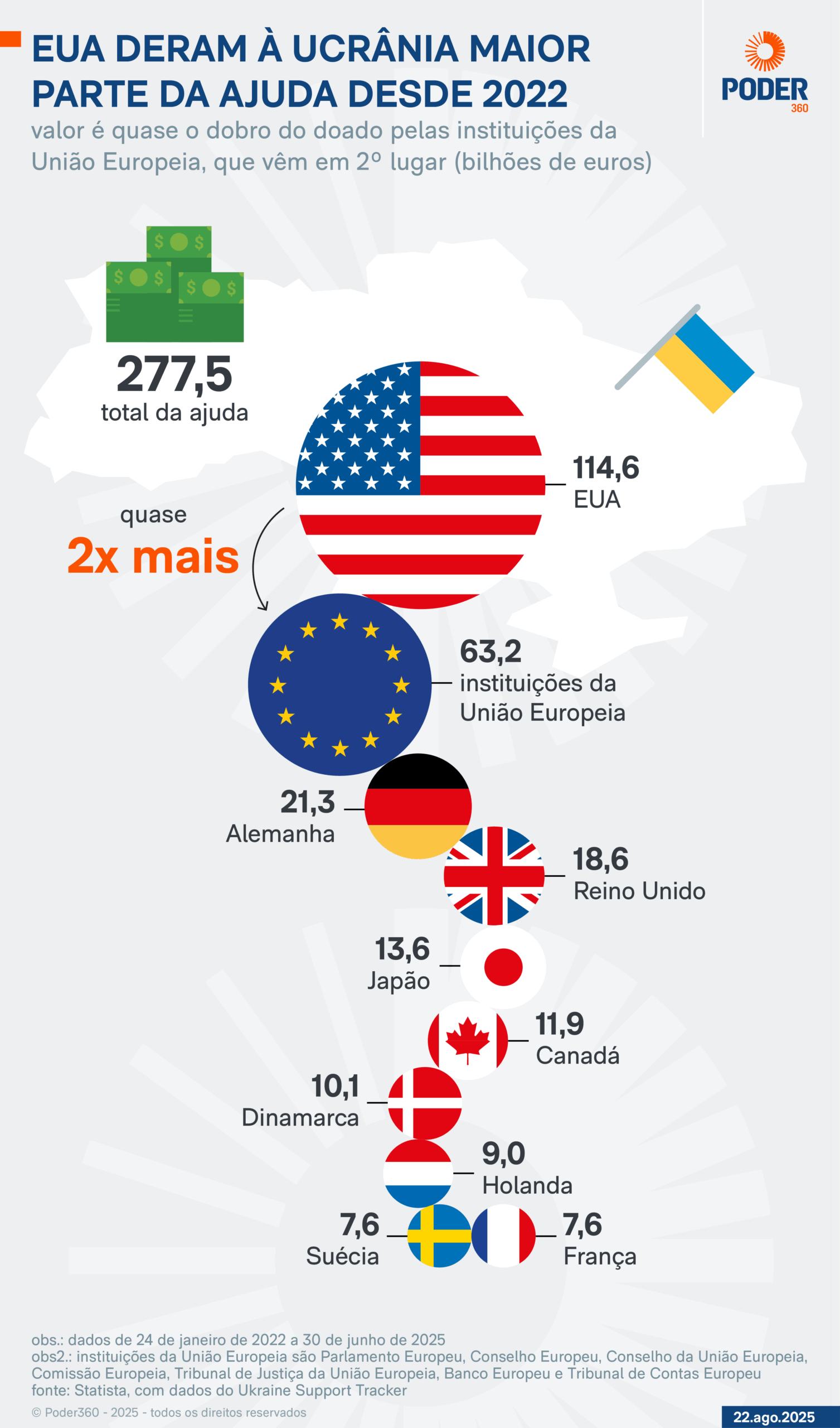 Somados os valores dos top 10 que mais ajudam a Ucrânia, foram 277,5 bilhões de euros de 24 de janeiro de 2022 a 30 de junho de 2025 enviados ao país.