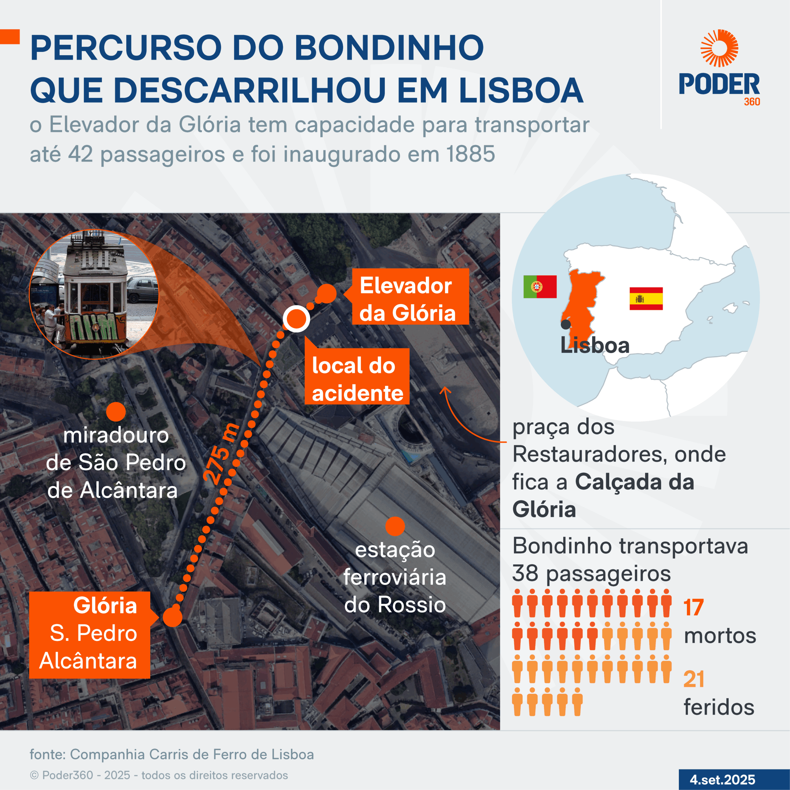 A decisão foi tomada depois do acidente com o Elevador da Glória, um dos principais pontos turísticos de Lisboa (Portugal), que descarrilhou na 4ª feira (3.set.2025), deixando ao menos 17 mortos. Há ainda 21 pessoas feridas, 7 delas em estado grave. Uma criança de 3 anos está entre os feridos. O bondinho transportava 38 pessoas no momento do acidente.