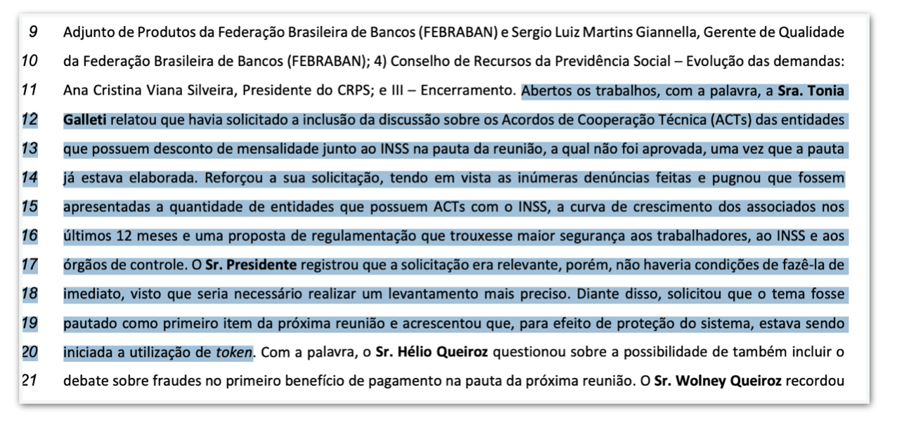 Na reunião de 2023, a conselheira Tonia Galleti pediu para incluir na pauta do dia uma discussão sobre os ACTs (Acordos de Cooperação Técnica) das entidades que têm desconto de mensalidade junto ao INSS.