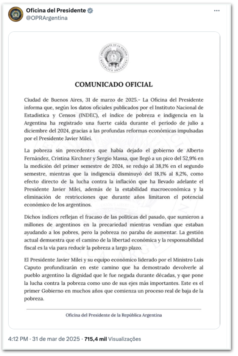 Esta é a 1ª vez que o índice de pobreza diminui na Argentina desde a posse do presidente Javier Milei (La Libertad Avanza, direita), em dezembro de 2023. Em comunicado publicado na conta oficial da presidência, a gestão Milei atribuiu o resultado às “profundas reformas econômicas promovidas pelo presidente Javier Milei” e que o índice anterior de 52,9% foi uma “pobreza sem precedentes deixada pelos governos de Alberto Fernández, Cristina Kirchner e Sergio Massa”.