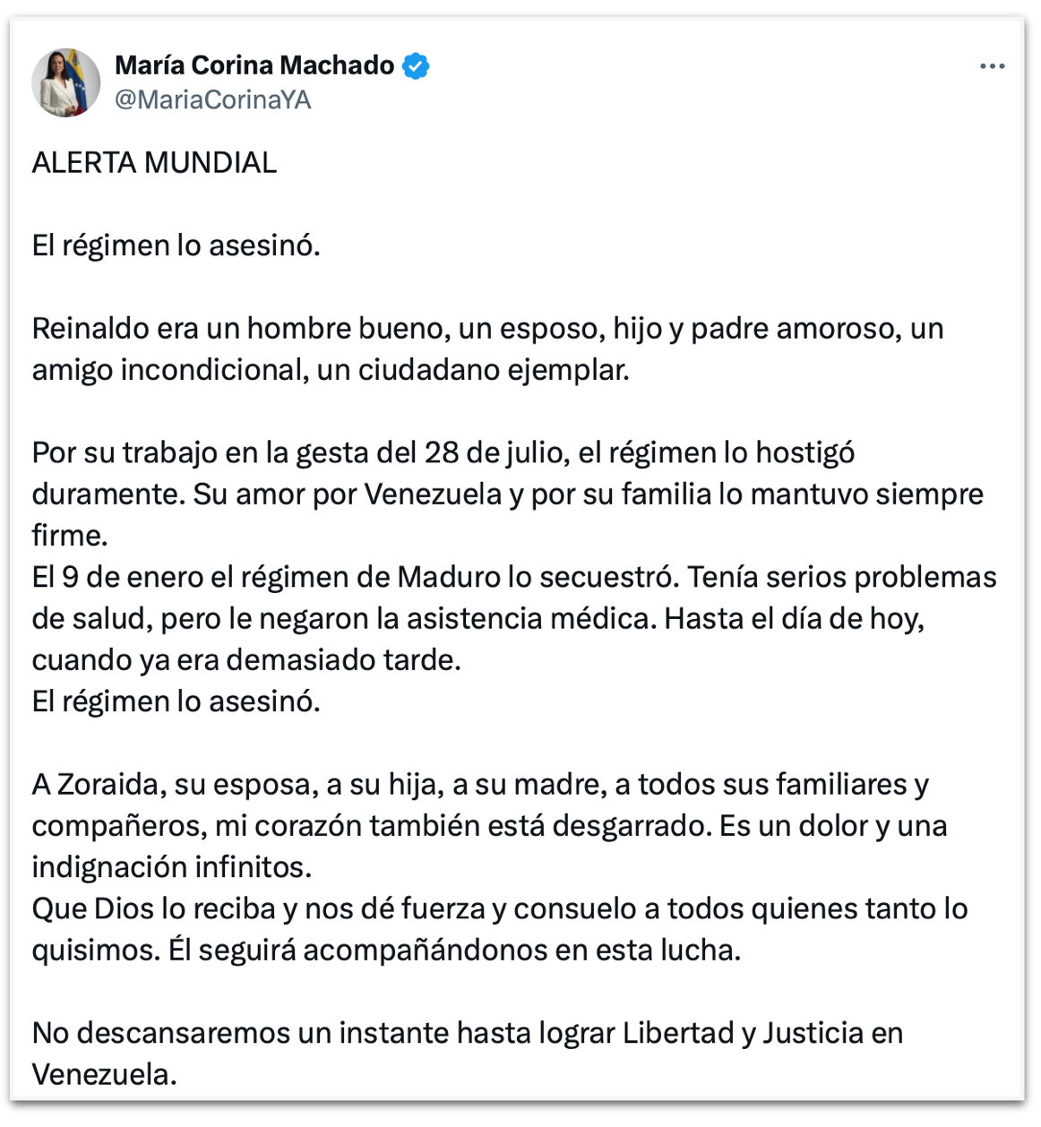 Em sua mensagem, a opositora expressou condolências à mulher, à filha e à mãe de Araujo. “Reinaldo era um homem bom, um esposo, filho e pai amoroso, um amigo incondicional e um cidadão exemplar”, afirmou. “Não descansaremos um momento sequer até alcançarmos a liberdade e a justiça na Venezuela”, disse.