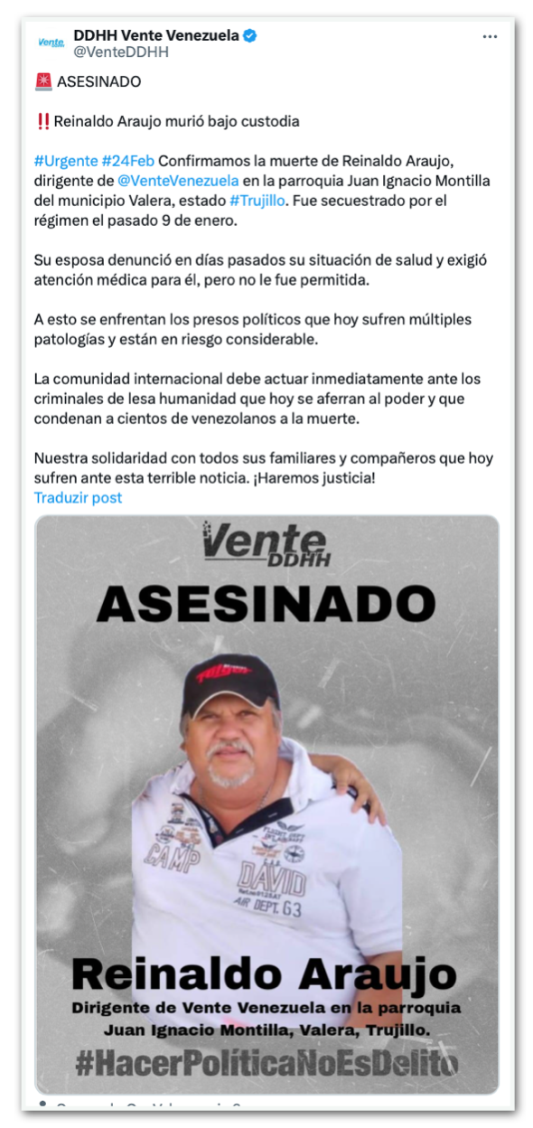 A Comissão de Direitos Humanos do Vamos Venezuela informou que Araujo era dirigente da legenda na paróquia Juan Ignacio Montilla, no município de Valera, a 593 km a oeste da capital Caracas. “Sua esposa denunciou seu estado de saúde nos últimos dias e exigiu atendimento médico para ele, mas não foi autorizada a fazê-lo”, afirmou o partido em comunicado também publicado no X.