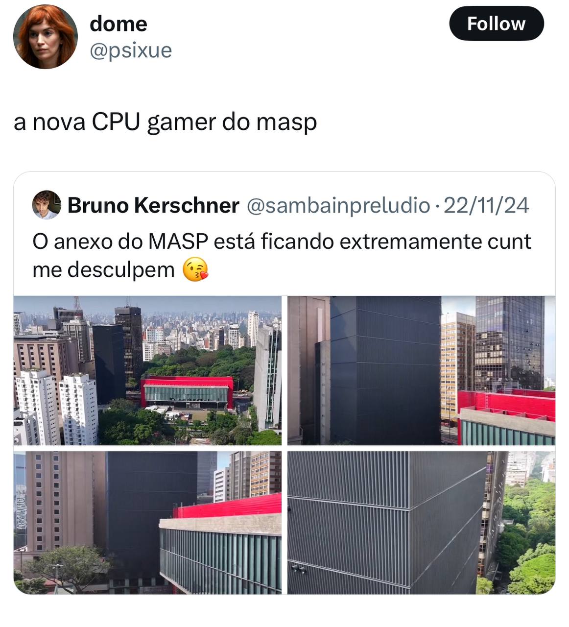 Em tom de humor, usuários do X (ex-Twitter) compararam o prédio a uma unidade central de processamento de computador. Entre os paulistanos, a construção ficou conhecida como “a CPU da avenida Paulista”.