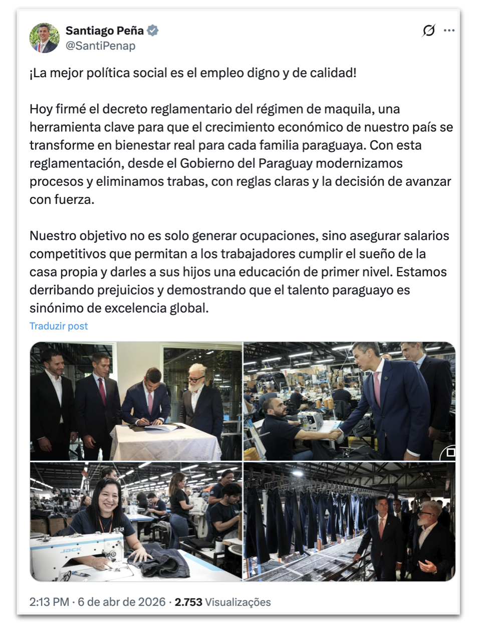 “Hoje assinei o decreto de implementação do regime maquilador, instrumento fundamental para garantir que o crescimento econômico do nosso país se traduza em bem-estar real para todas as famílias paraguaias. Com essa regulamentação, o Governo do Paraguai moderniza processos e elimina obstáculos, estabelecendo regras claras e demonstrando um firme compromisso com o progresso.