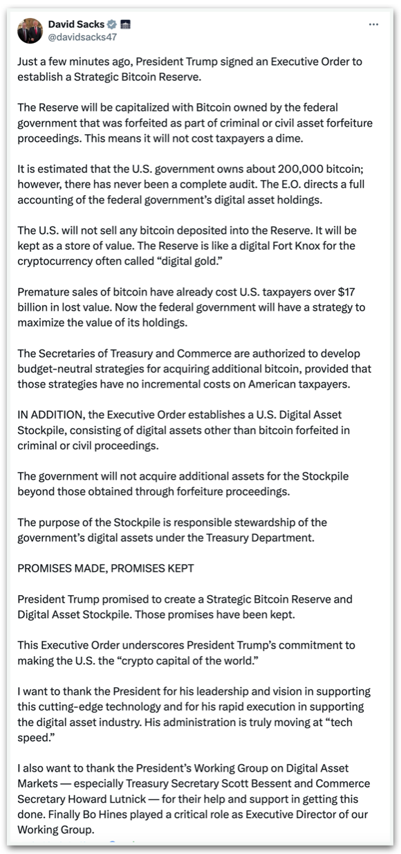 “Há poucos minutos, o presidente Trump assinou uma Ordem Executiva para estabelecer uma Reserva Estratégica de Bitcoin.
