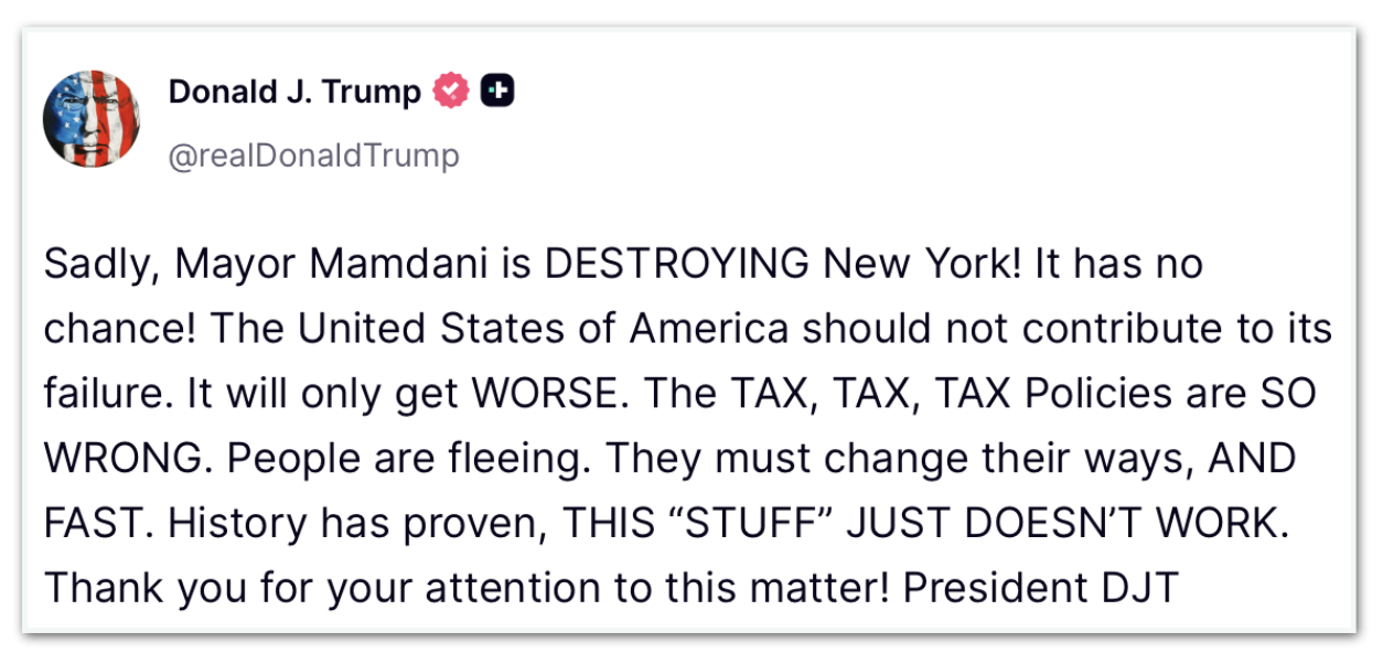 Na publicação, Trump declarou o seguinte: “Infelizmente, o prefeito Mamdani está destruindo Nova York! A cidade não tem a menor chance! Os Estados Unidos não devem contribuir para esse fracasso. Só vai piorar. As políticas de impostos, impostos, impostos estão muito erradas. As pessoas estão fugindo. É preciso mudar de ideia, e rápido. A história já provou que essa ‘coisa’ simplesmente não funciona”.