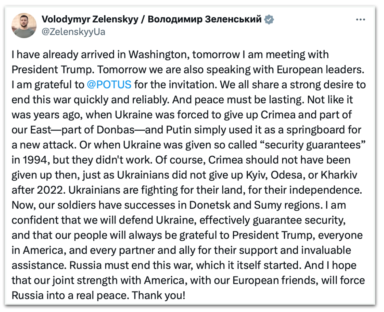 “Estou confiante de que defenderemos a Ucrânia, garantiremos a segurança de forma eficaz e que nosso povo sempre será grato ao presidente Trump, a todos nos Estados Unidos e a todos os parceiros e aliados por seu apoio e assistência inestimável. A Rússia precisa pôr fim a esta guerra, que ela mesma iniciou. E espero que nossa força conjunta com os Estados Unidos e nossos amigos europeus force a Rússia a uma paz verdadeira”, declarou Zelensky.
