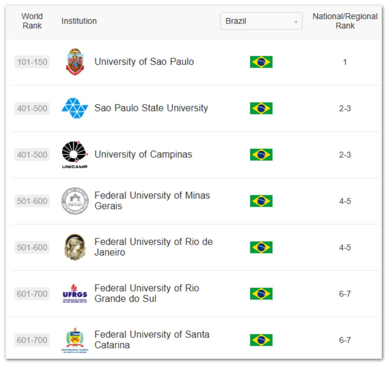 Além das instituições brasileiras, apenas outros 3 países latino-americanos figuram na lista. A Universidade de Buenos Aires está no grupo 201-300; a Pontificia Universidad Católica de Chile e a Universidad de Chile aparecem no grupo 501-600. Já a Unam (Universidade Nacional Autônoma do México) e o IPN (Instituto Politécnico Nacional), ambos do México, estão nos grupos 201-300 e 501-600, respectivamente.