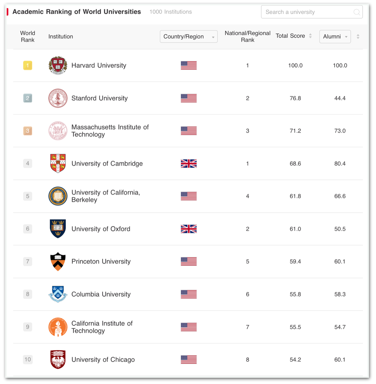 Os 10 primeiros lugares são ocupados apenas por universidades de países de língua inglesa. O “top 3” é todo norte-americano, liderado pelo 23º ano consecutivo pela Universidade Harvard. A instituição de ensino é seguida por Stanford e MIT (Massachusetts Institute of Technology). Na sequência aparecem Cambridge (Reino Unido), Berkeley (EUA), Oxford (Reino Unido), Princeton (EUA), Columbia (EUA), Caltech (EUA) e Universidade Chicago (EUA).