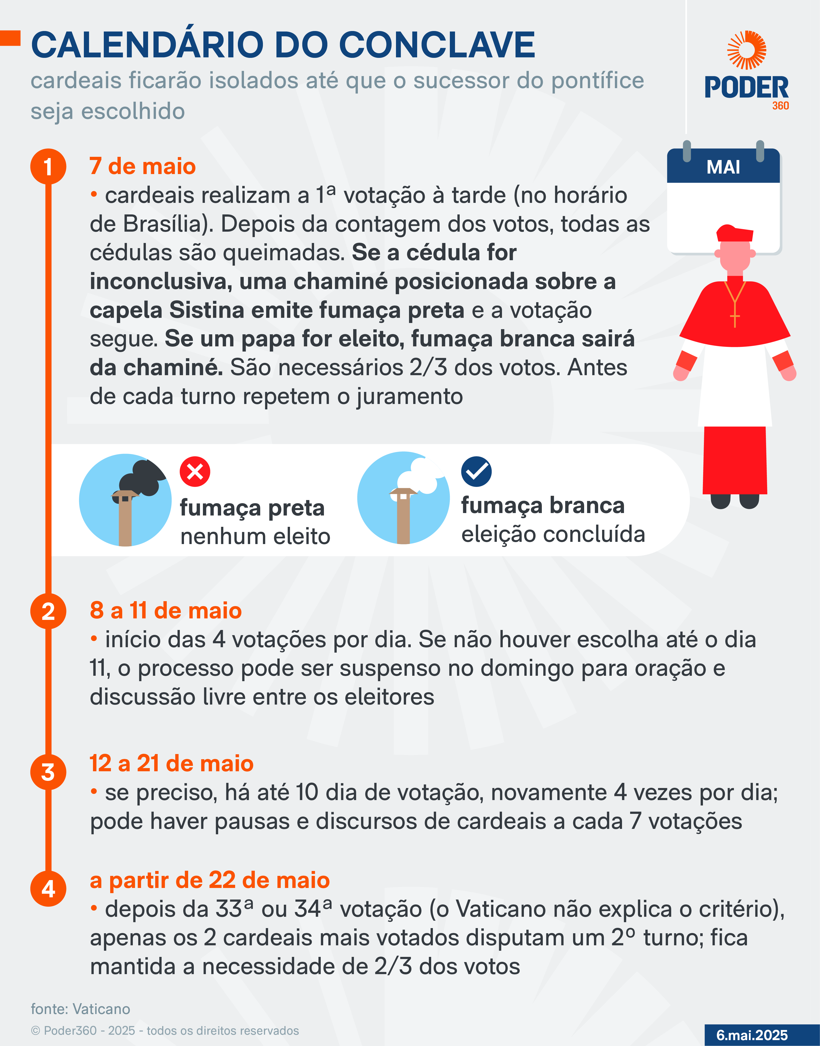 Ainda nesta 5ª feira (8.mai), os cardeais realizarão duas outras votações no conclave. Até 22 de maio, a eleição para escolha do novo papa será feita 4 vezes ao dia, com 2 pleitos pela manhã e outros 2 pela tarde.